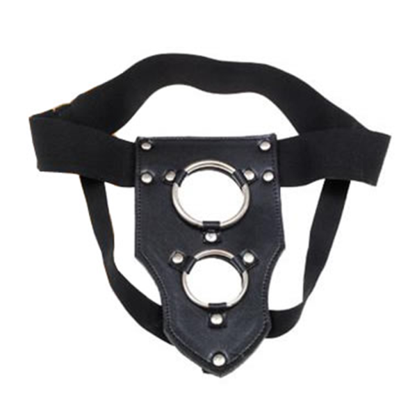 El arnés de cuero con doble aro es un modelo resistente, cómodo y adaptable, pensado para sostener uno o dos dildos con base o ventosa al mismo tiempo.